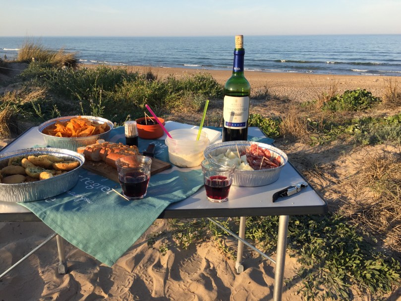 Die Düne zwischen dem Meer, dem Strand und dem Campingplatz erwies sich wie geplant und durch warmes Wetter unterstützt, als herrlich sonniges Abendplätzchen mit gutem Blick in die Berge und über das Wasser.