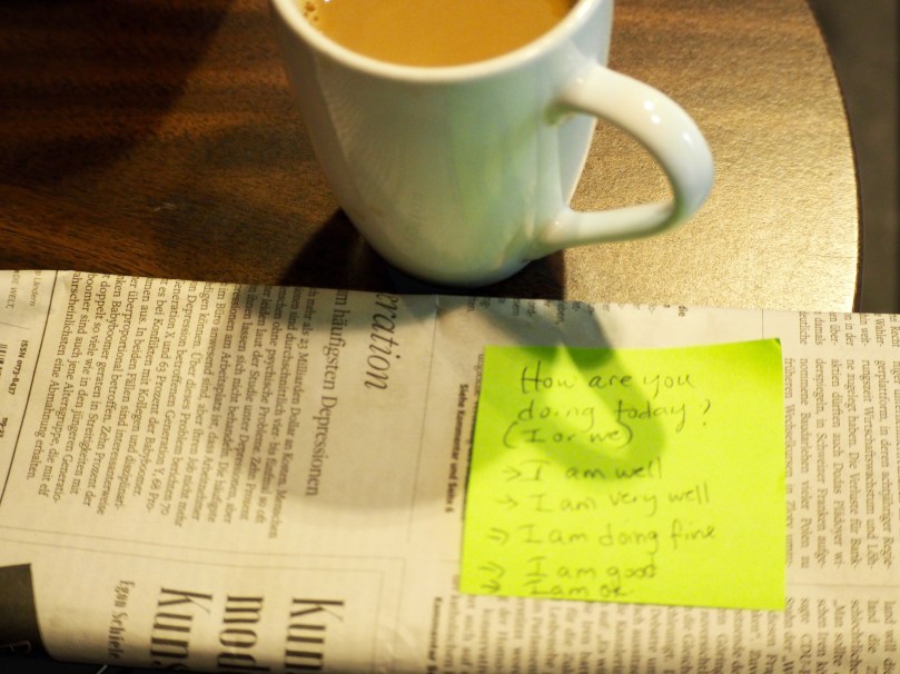Ich traue mich, die nette Frau im Cafè zu fragen: „welche Antwort erwarten die Menschen für den Fall, dass ich immer gefragt werde: How are you doing today?“