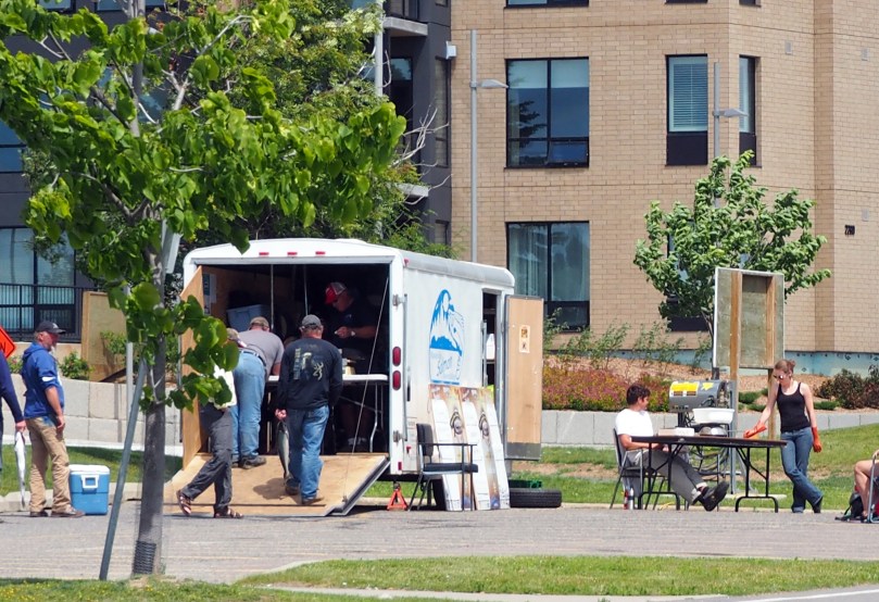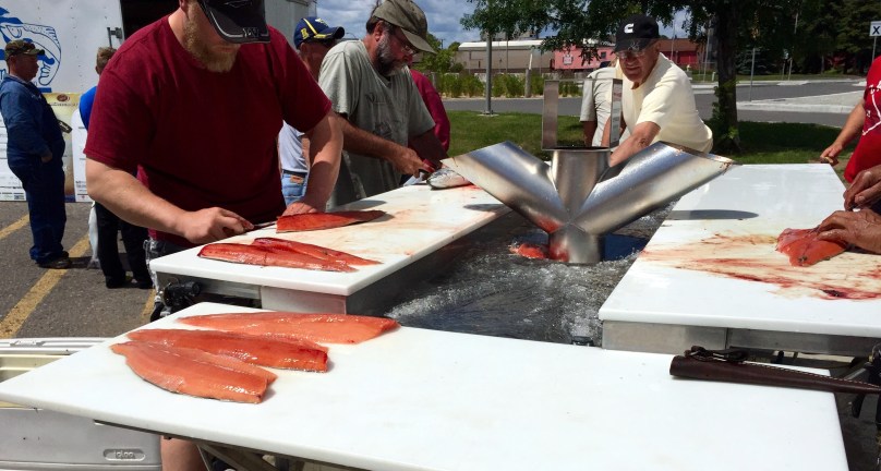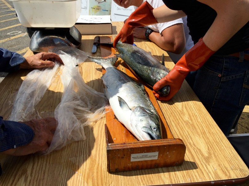 und werden damit überrascht, dass hier die Mess- und Wiegestelle der „Thunder Bay Salmon Association“ Platz genommen hat, um im diesjährigen 3-tägigen Salmon-Derby die Sieger herauszufinden.