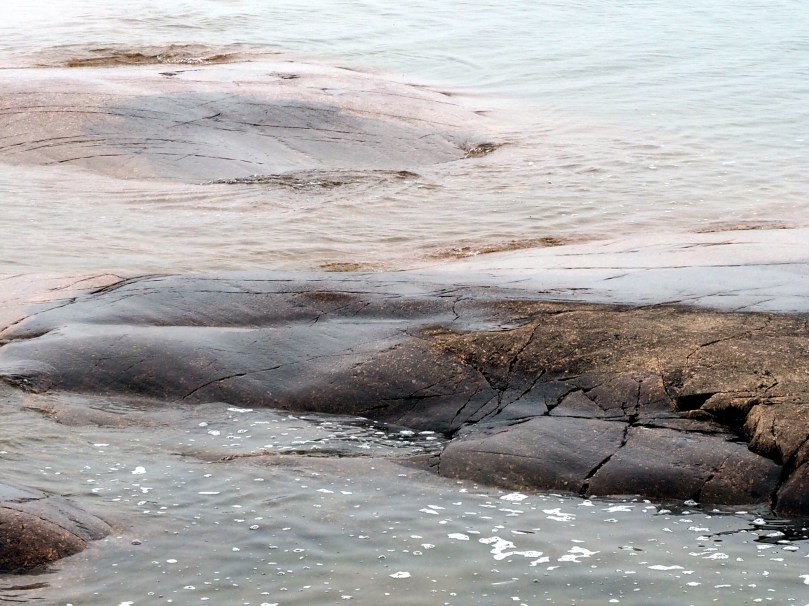 Das Wasser springt den spiegelglatten Felsen entgegen- sie müssen es sich gefallen lassen, dass sie mal wieder geschliffen werden, ob sie es wollen oder nicht.