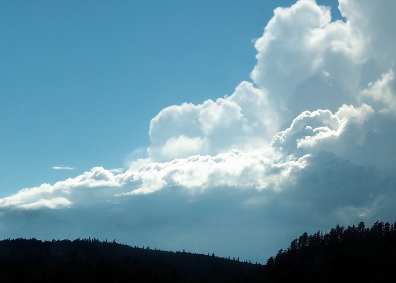Die Wolken gestatten sich ihre Dramatik vor knallblauem Hintergrund in einer wattig-weißen Dichte und Formenvielfalt, als wenn sie sich mit aller Macht gegen irgendwelche Gegner so schnell es geht durchsetzen müssten.