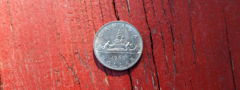 Wir bekommen am Ende eines kurzen Gespräches einen canadischen Dollar geschenkt, der schon älter ist und ein geprägtes Bild von einem Kanu mit zwei Menschen darin zeigt.