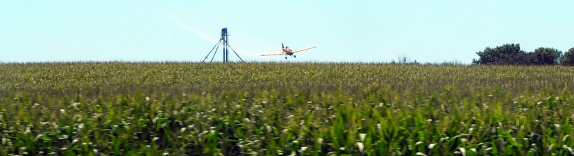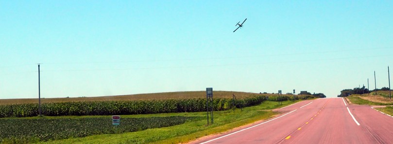 Bis es uns aus dem fahrenden Auto heraus klar wird, das sind fliegende „Pestizidspritzen“, die über ganz bestimmten Flächen ihren „Pflanzenschutz“-Nebel aus vielleicht fünf Metern Höhe aus ihren an der Unterseite der Maschinen angebrachten „Lanzen“, mit vielen Düsen versehen, ablassen.