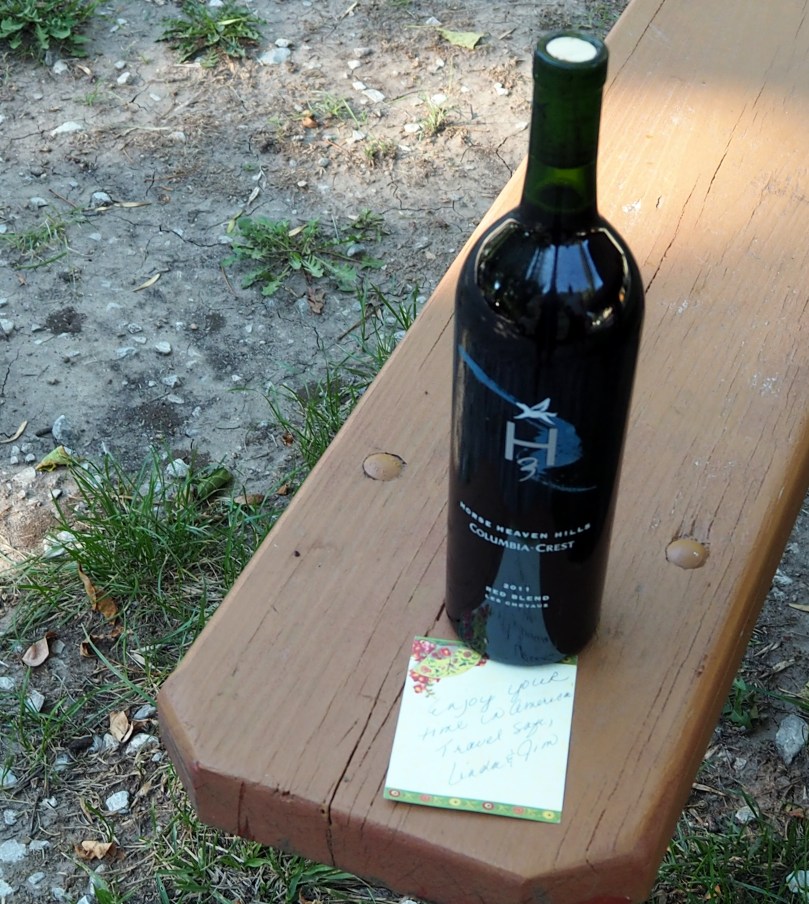 Aber die Sonne scheint gleich doppelt: denn auf der Picknickbank strahlt mich eine Flasche Rotwein an mit einem kleinen Zettel bespickt…