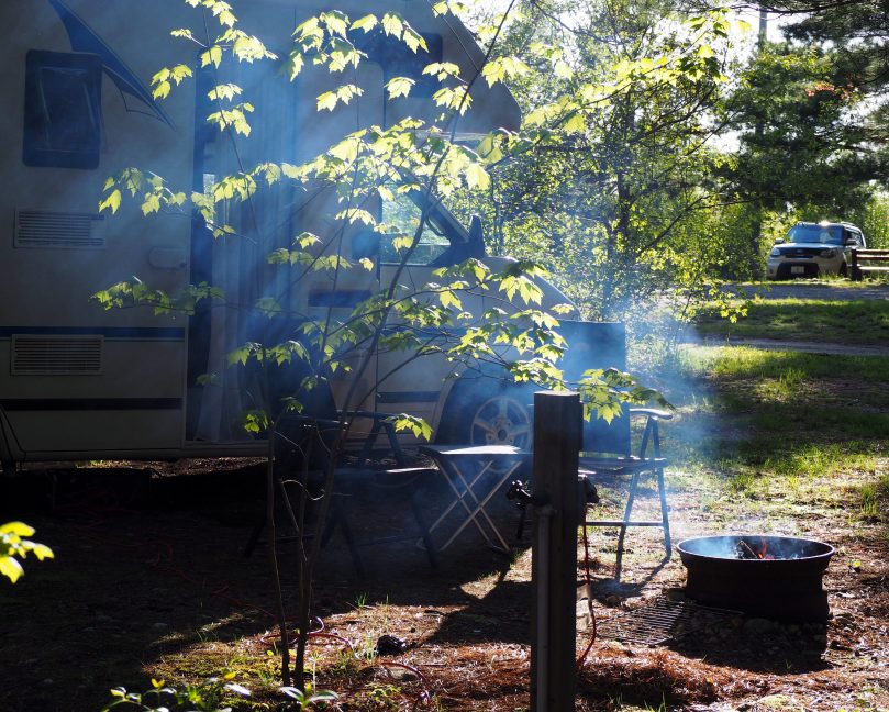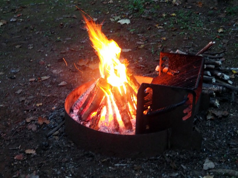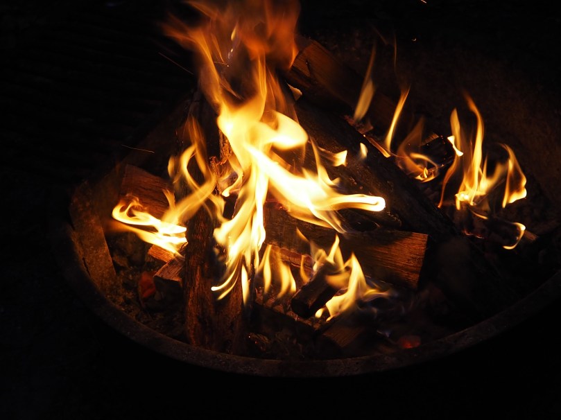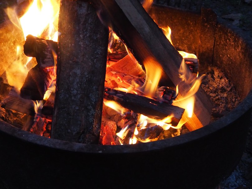 Die gelb-orange-blaugrau züngelnden Flammen werden vom Wind im kreisrunden, von der häufigen Benutzung total geschwärzten, Firepit hin- und hergerissen, gedeckelt, angestachelt, auseinander gerissen und manchmal auch in Ruhe gelassen.