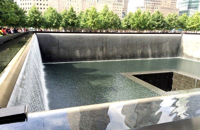 Es sind so viele Menschen dort, die die beiden großen quadratischen Wasserbecken, die den Grundriss der Türme skizzieren, mit dem hineinströmenden Wasserfall und alles in anthrazitfarbigem, poliertem Stein