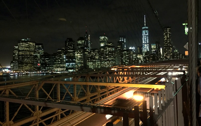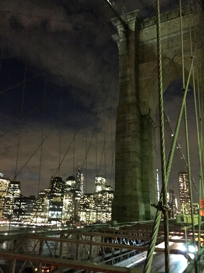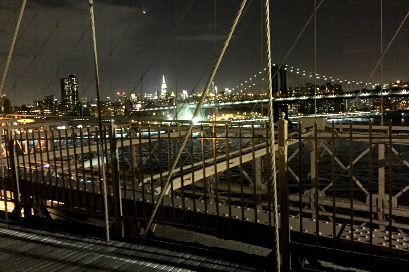 Der Boden unter mir und die nähere Umgebung liegen fast vollständig im Dunklen, aber die Richtung geben die weihnachtsbaumartige Beleuchtung der Drahtseile und die Skyline von Manhattan vor.