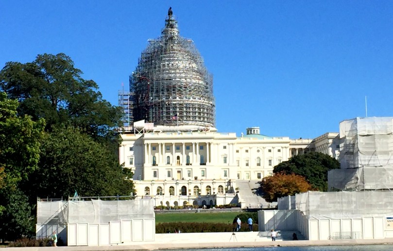 Die eigentlich herrlich weiße Kuppel des Capitol, auf dem erhabenen Capitolhill gelegen, ist komplett eingerüstet