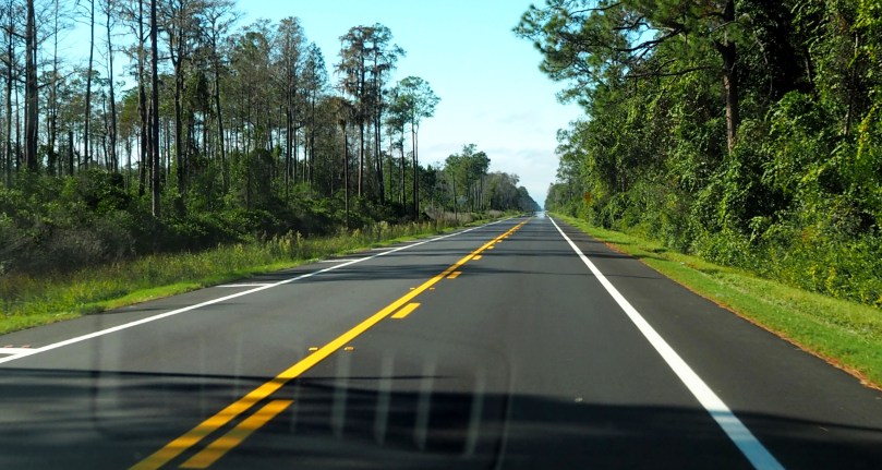 Schnurgerade über 85 Meilen (x 1,6 für km) nur durch jeweils eine Kreuzung in drei Hausansammlungen, die man nicht „Orte“ nennen kann, unterbrochen, zieht sich der Hwy durch kultivierte Kiefernwälder und Neuanpflanzungen.