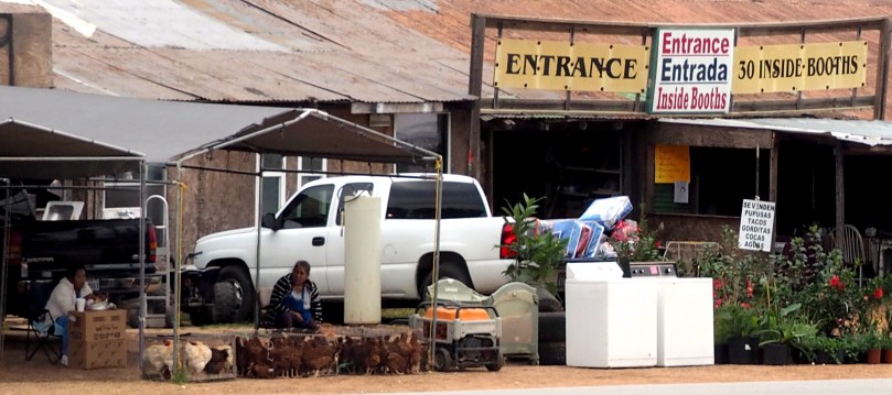 oder wohl ziemlich selbstverständlich auf dem Seitenstreifen auf einem mexikanischen Markt Hühner verkauft werden.