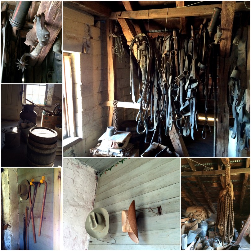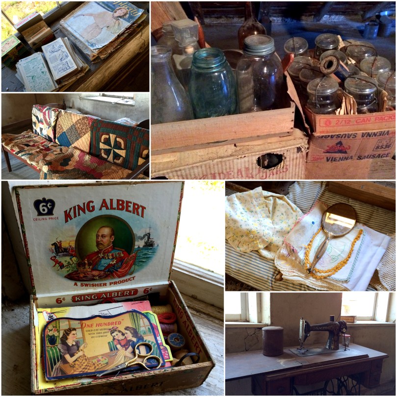 Einmachgläser, Zeitschriften, Lampen, Pferdesättel, Zaumzeug, Sporne, Nähmaschine, Matratzen, alte Bücher, Thermometer, Quilts und mit Bordüren bemalte Holzwände.