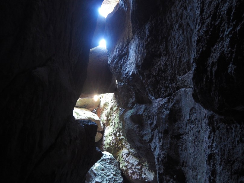 Rucksack absetzen, durchklemmen, geht so grade, dann plötzliches Tageslicht, eine Weggabelung… Wo ist sie?