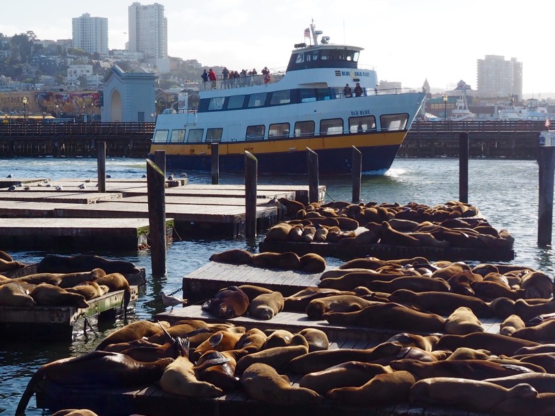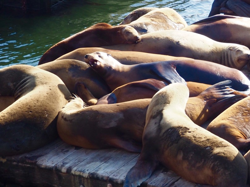 mit den berühmten Seelöwen, die alle in einer „Mietwohnung“, den für sie extra verankerten Pontons im Hafen, über- und untereinander wohnen, dicht an dicht, obwohl ganze Pontons gänzlich leer sind.