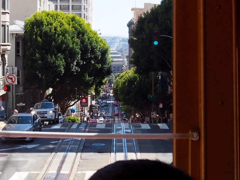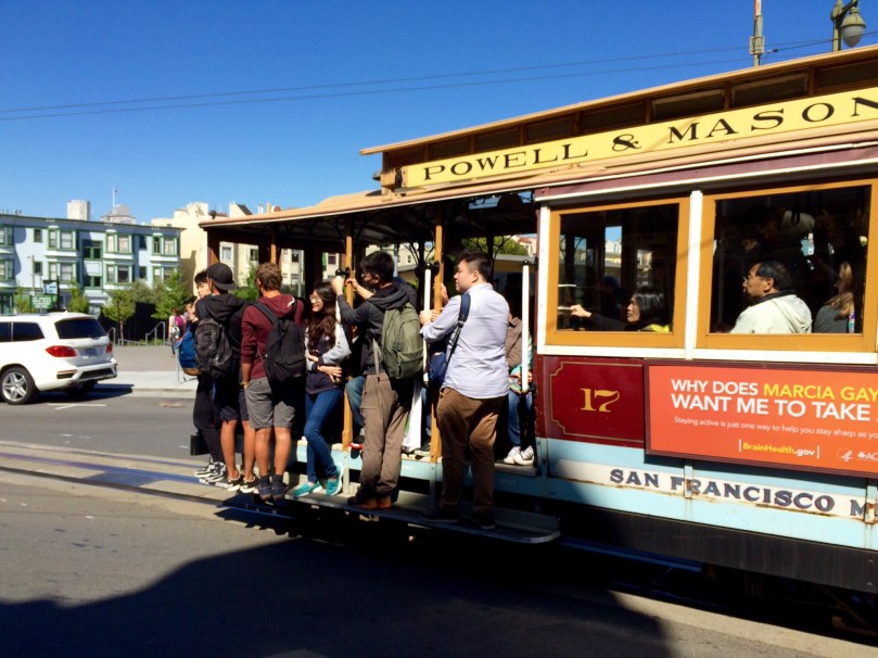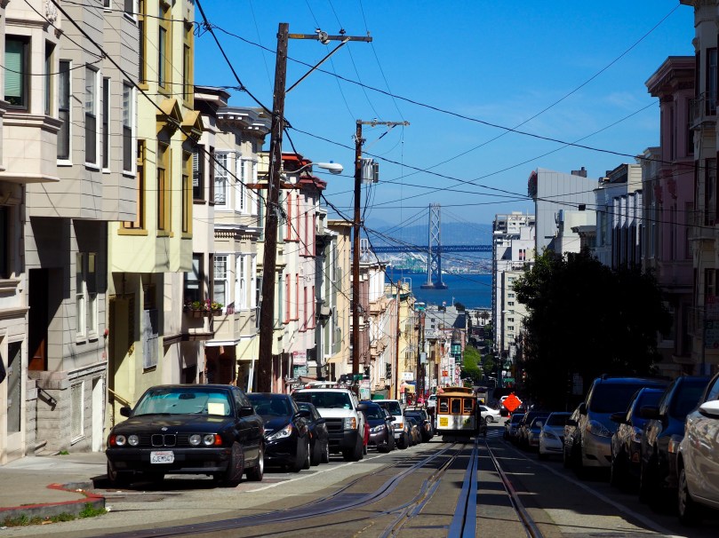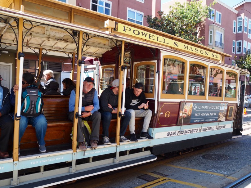 Ein relativ kurzer Fußweg und ein Restsprint sichert uns, was ein Wunder bei diesen vielen Menschen, die mit der Cable Car fahren möchten, an der Endstation Bay Ecke Taylor einen Platz auf einer dieser „Bähnlein“ Richtung Market, die einzigartig bergauf und -ab die ganze Innenstadt durchquert.
