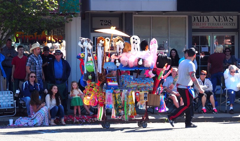 Ungefähr ein geschätztes Viertel der Bevölkerung Red Bluffs sitzt in SUV’s, auf Mottowagen, Truckanhängern, Pferden, Zweirädern oder läuft zu Fuß nebenher, Prospekte und „Karamelle“ für die zahlreichen am Rand sitzenden Kinder verteilend.