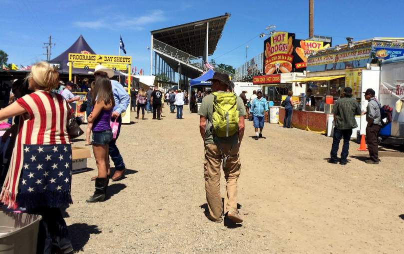 Gleichzeitig flanieren Tausende von Leuten zwischen Hut-, Caps-, T-Shirt- und Fress- und Getränkeständen ohne Ende. Wie gut, dass wir schon so früh gekommen sind. Ein herrliches Spektakel.