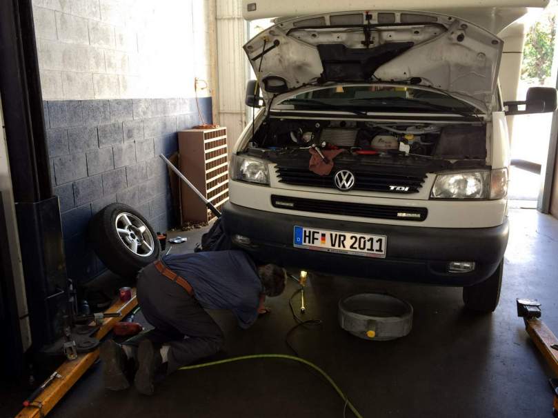 Um 7 am zog Chris, der absolut nette Monteur dieser Truppe, der uns gestern Abend noch mit dem Schlüssel für’s große Gatterschloss versorgt hat, die Werkstatttore hoch!