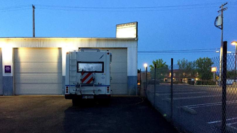 Wir haben heute Nacht Premiere, unser Übernachtungsplatz heißt „Red Bluff Auto Clinic“!
