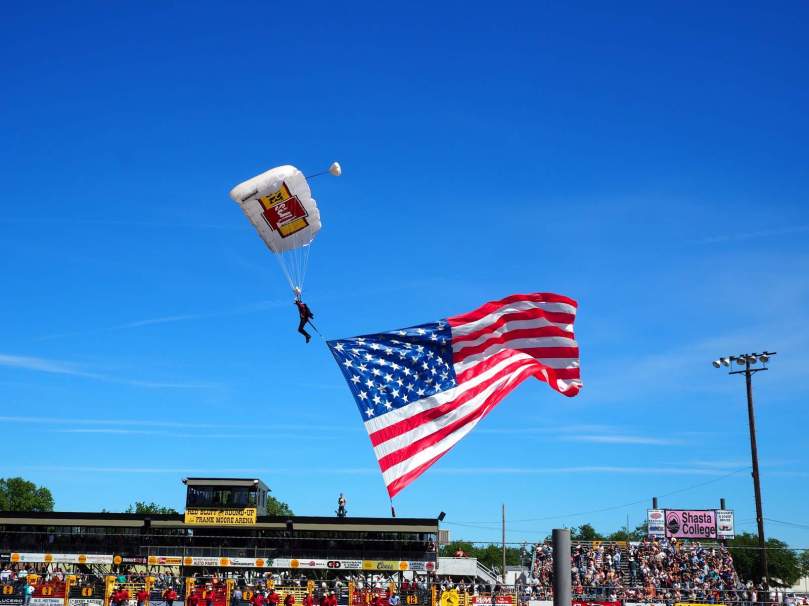 Der erste Akt, die amerikanische Nationalflagge, fällt zusammen mit einem Paraglider unerwarteterweise direkt vom Himmel und konsequenterweise folgt ihm der Zweite: Alles aufstehen, junge Soporanstimme singt The National Anthem…