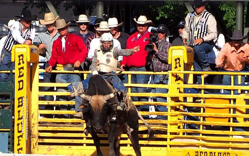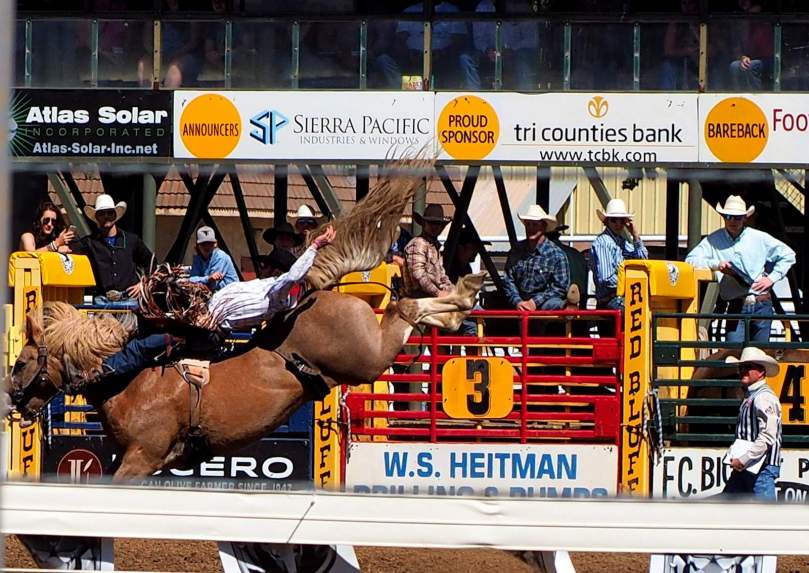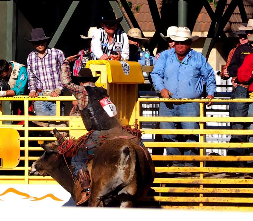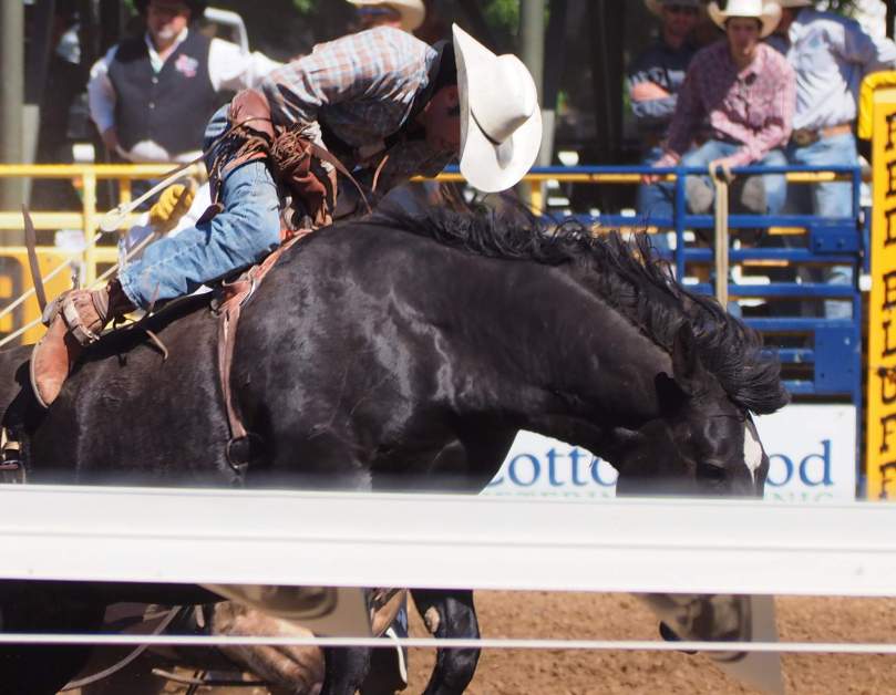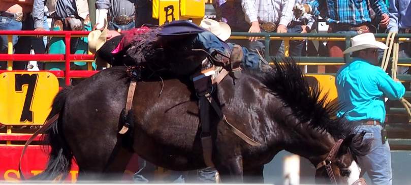 Dabei wissen wir inzwischen, dass sich die Pferde überhaupt nicht für den Wunsch ihrer Reiter interessieren, sich einhändig in der Nähe des Sattels festhaltend, mindestens acht Sekunden auf ihren Rücken zu bleiben, sondern als erfahrene Rodeopferde darauf aus sind, so schnell wie möglich ihre auf der dünnen und daher empfindlichen Unterleibshaut festgezurrten „Flankengurte“ loszuwerden!