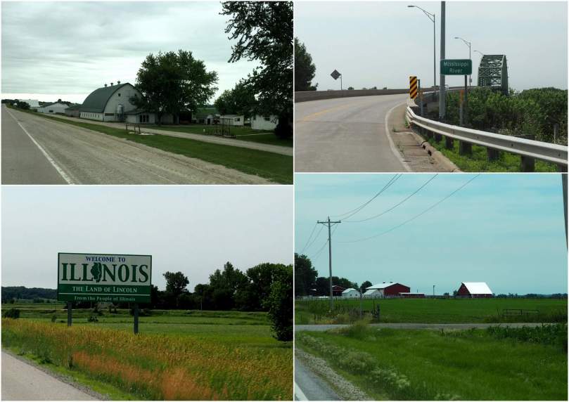 Der sonntägliche Verkehr, fast ohne Trucks, könnte uns unmerklich nach Illinois gebracht haben, aber das große grüne Schild direkt hinter der Brücke über den Mississippi weist uns darauf hin, dass wir dem Land am Lake Michigan mit seiner Hauptstadt Chicago immer näher kommen.
