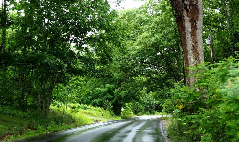 Schon macht uns der Regen in den Wäldern und kleinen Ortschaften, die wir durchqueren, nichts mehr aus. Sitzen ja im Trockenen und können sogar das besonders intensive Grün der vom Regen „geputzten“ Blätter auf den Bäumen wahrnehmen.