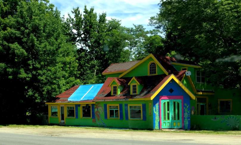 Vorbei an mutig bemalten Häusern, dieses war mal ein mexikanisches Restaurant, cruisen wir durch die sommerliche, uns an Skandinavien erinnernde Landschaft.