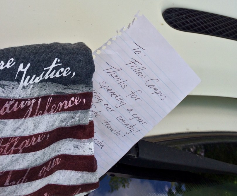…und hätten völlig übersehen, dass auf der Motorhaube direkt am unteren Rand der Windschutzscheibe ein gewaschenes T-Shirt mit einem Zettel liegt! Vero’s Ruf: „Stop!“ macht mich darauf aufmerksam und lässt mich anhalten.