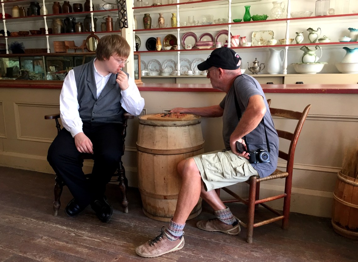 Von den hier zum Verkauf angebotenen Waren benötigen wir nichts, aber es macht Spass, sich im Laden beim Dame-Spiel die Zeit zu vertreiben. Die Regeln sind über die zweihundert Jahre offensichtlich unverändert geblieben, aber der junge Mann hatte gegen mich alten Zocker doch keine Chance…