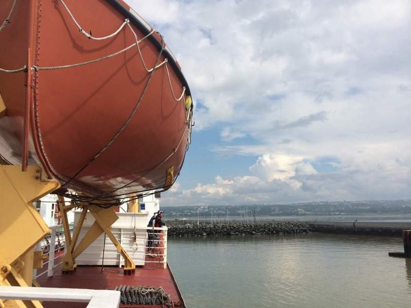 Wir warten anderthalb Stunden auf die Abfahrt des Schiffes und freuen uns, dass die Längenmessung unseres Robels inklusive Fahrradträger die Einstufung als „Car“ ergibt und nicht als „Motorhome“!