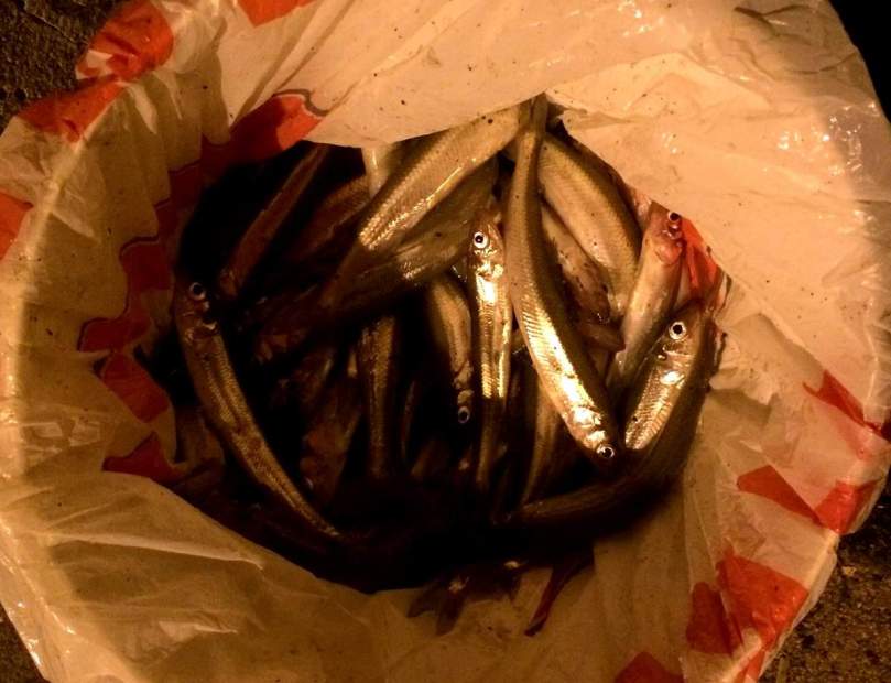 Sie, diese kleinen sardinenähnlichen Fische hängen anschließend zwei Stunden lang in ungezählten Mengen an unseren Haken, wovon jeweils sechs übereinander an der Schnur befestigt sind. Mindestens zwei davon, egal ob mit Wurmköder oder ohne erregen die Aufmerksamkeit dieser blöden Fische offensichtlich so sehr, dass sie gar nicht anders können als, zu unserem Vorteil, daran ihr Leben zu hängen…