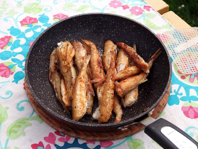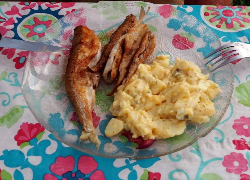 Wir bekommen unseren Anteil am nächsten Tag fertig ausgenommen, wir müssen sie nur noch braten, und sie schmecken vorzüglich zu Vero’s Kartoffelsalat.