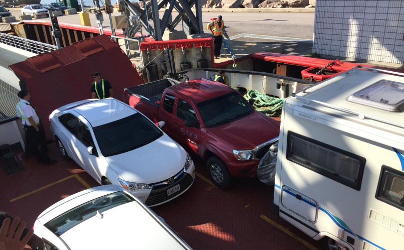 Ganz schön blauäugig: Ein einziger Mann steigt in den einzigen (seinen) Wagen. Er hat so etwas wie eine „Uniform“ an. Wir haben zumindest was seine Zuständigkeit anbetrifft offenbar Glück. Wie sich in der Einsamkeit des kleinen Hafens herausstellt, ist er der registrierende Mitarbeiter der Fährgesellschaft, der uns hilfsbereit, er telefoniert für uns, die Hoffnung vermittelt, in drei Stunden um 4pm, mit der nächsten Fähre doch noch mitzukommen.