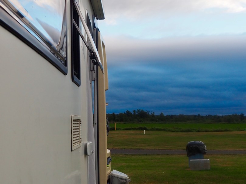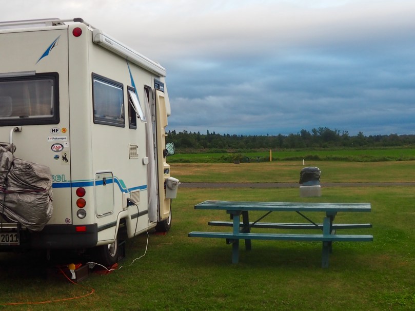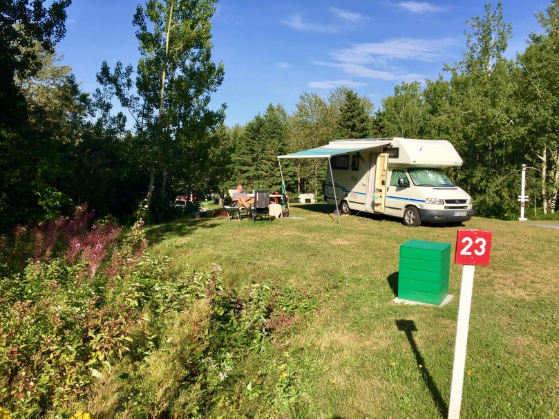 Als wir auf der anderen Seite ankommen, hat Vero schon recherchiert, dass der nächste Campground gleich um die Ecke liegt, Camping Municipal Trois Pistoles.