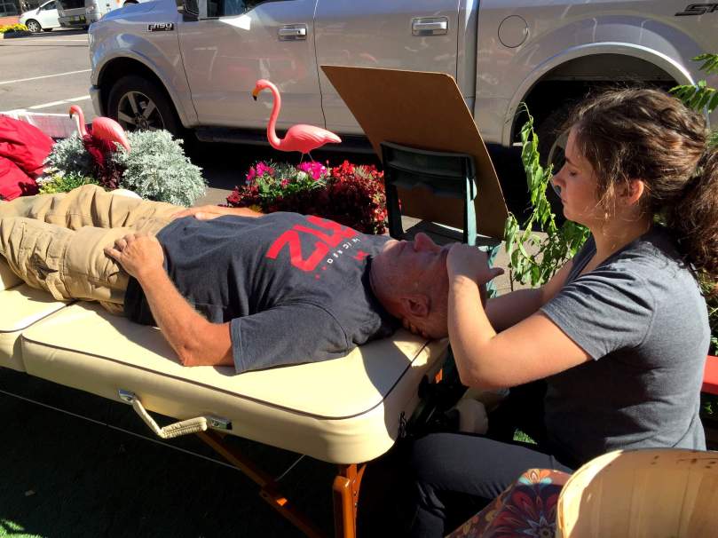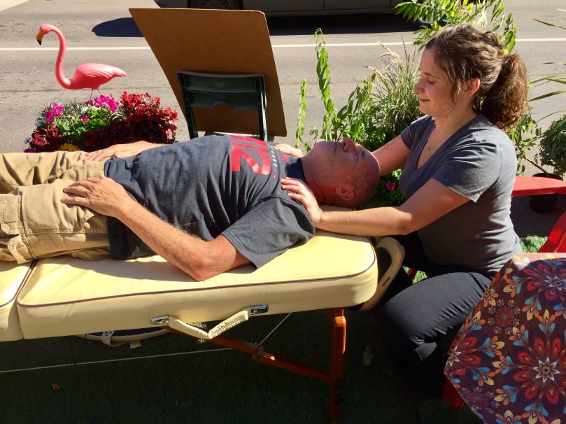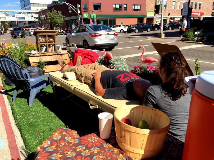 Wie kann ich an diesem Freitagvormittag vermuten, dass mir Mitarbeiterinnen und Mitarbeiter der städtischen Verwaltung heute, es ist Park(ing)day (https://de.wikipedia.org/wiki/Parking_Day) , unter anderem als Physiotherapeutinnen, kostenlos eine Hals- und Nackenmassage anbieten und durchführen. Einfach genial…