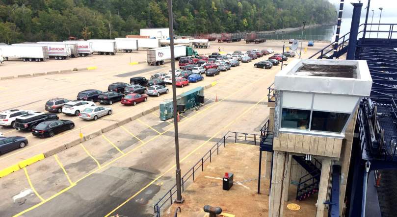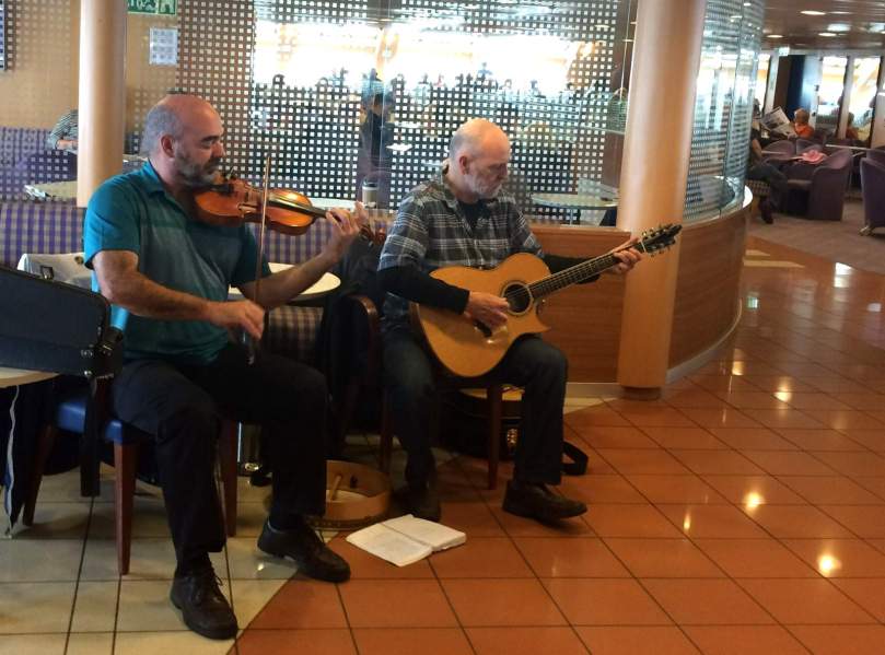 Wir kennen das natürlich inzwischen schon: Für Fahrzeuge über 7 Fuß Höhe gibt es keine Möglichkeit der Platzreservierung und es heißt, früh genug, nämlich um 10 am im Hafen zu sein um mitzukommen. Es klappt. So richtig begeistert sind wir allerdings nicht: Denn mit einem Preis von 240 Canadian $ (163 €) für eine 2 1/4 stündige Seefahrt haben wir nicht gerechnet. Aber ein Kaffee unterwegs muss trotzdem sein! Dafür genießen wir kostenlos die irische Musik im Mitteldeck.