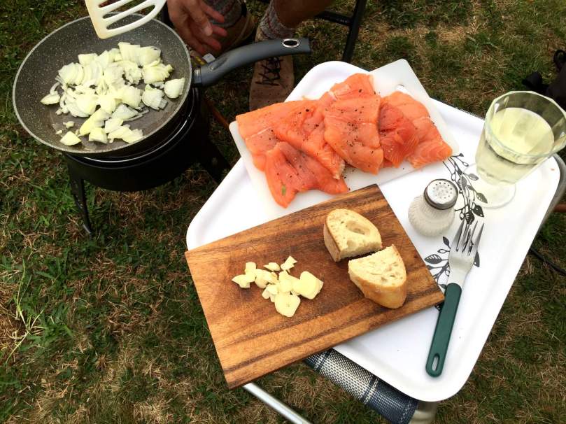 Auf Digby CG für zwei Übernachtungen angekommen, haben wir sofort Hunger und sind dafür mit Vorfreude auf den eben gekauften kanadischem Lachs versorgt: Der muss gleich dran glauben! Aus frischen Zwiebeln werden geröstete, so dass der Lachs auf ihnen in der Pfanne bald Gelegenheit hat, seine Farbe zu ändern und sein Brataroma ohne zu verbrennen zu entfalten. Der dazu gedachte grüne Salat liegt schon auf den Tellern und muss nur noch mit Dressings angereichert werden. Bevor hier erste Fragen kommen: Ja, das erste Glas Weißwein ist schon im Koch…