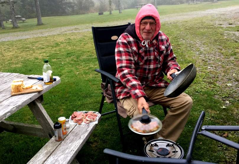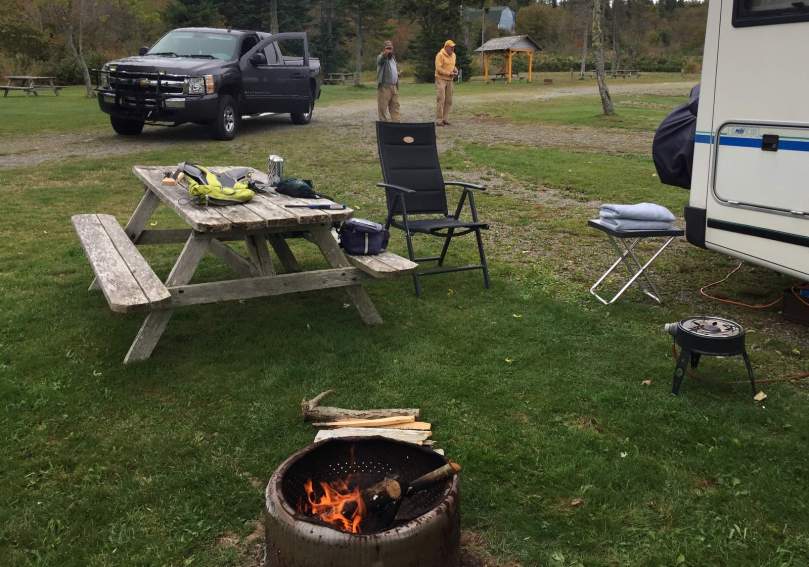 Von wegen Ocean View. Der Nebel liegt, Literaten würden schreiben, bleiern über der Atlantic Bay. Es ist aber andererseits durchaus heimelig. Die vom Nebel behinderte Weitsicht oder positiv ausgedrückt, verstärkt mögliche Kurzsicht, lässt uns gelassen, eben ohne ablenkende Fernsicht die innigen Bewegungen des so geliebten Campfires wahrnehmen.