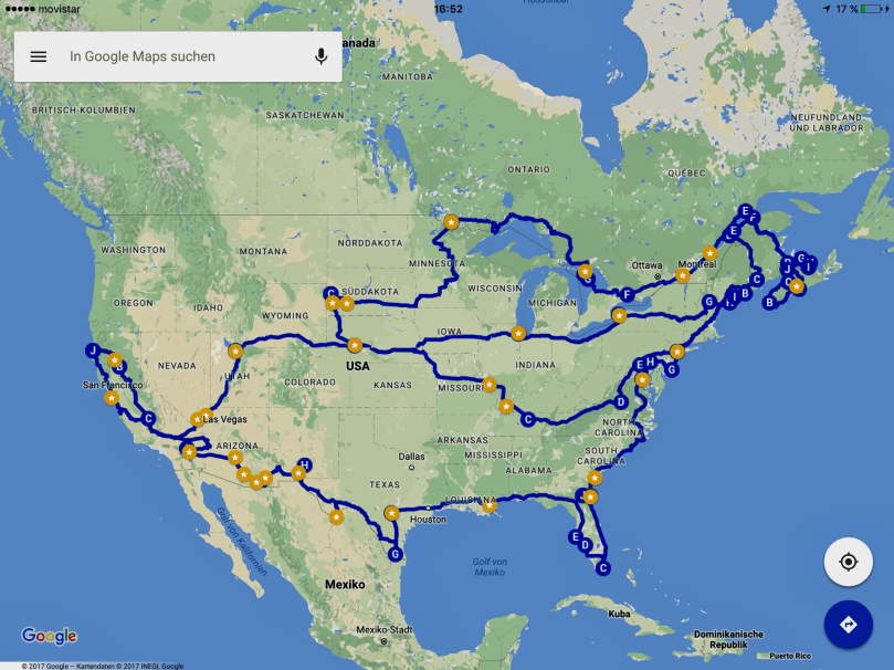 Der Officer im Front-Office des US-Grenzübergangs kann das nach vielen beantworteten Fragen nicht entscheiden. Er sieht auch das Routenfoto und kann durch Vero’s Erklärung nachvollziehen, welche Staaten wir noch besuchen wollen. Dass es nach sechs Monaten, es wäre dann März 2018, hier an der canadisch-amerikanischen Grenze noch sehr kalt ist und das in New Brunswick und Nova Scotia dann noch keine Campingplätze aufhaben, kann er durchaus auch nachvollziehen.