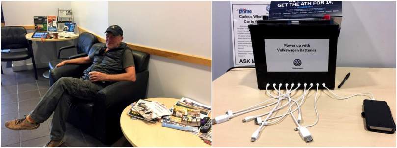 Wer sich mein Gesicht auf dem nächsten Foto etwas genauer anschaut, kann meine Skepsis als Kunde einer VW-Dealership in USA erkennen: hier steht das gesamte Equipment der Kundenversorgung vom Kaffeeautomaten über den Wasserspender, heiß und kalt bis hin zum kostenlosen Angebot, sich mit PopCorn kostenlos den Bauch voll zu schlagen.