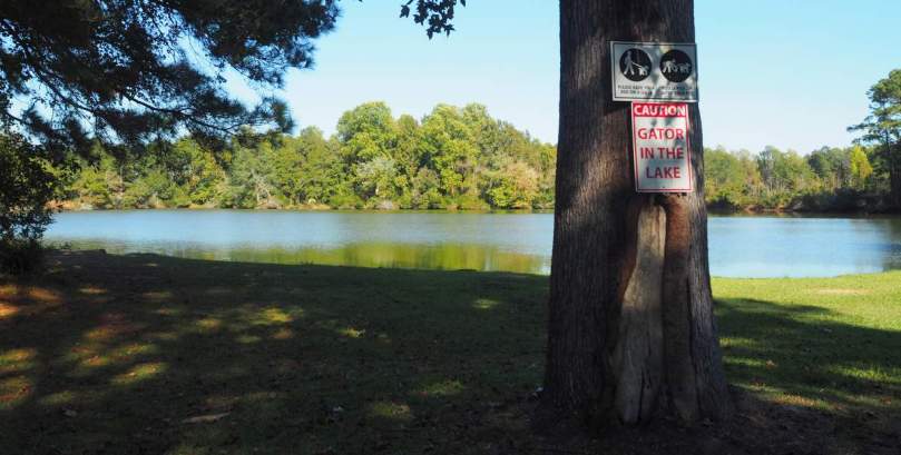Ob in dem See wirklich Aligatoren leben? Jedenfalls sichert das Schild den Campingplatzbesitzer gegen mögliche Regressansprüche wegen apper Beine oder so…