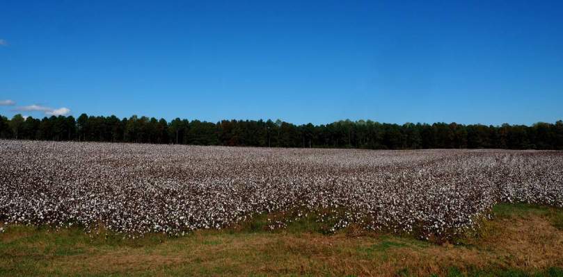Die Pflanzen auf den riesigen Feldern kündigen einen Klimawechsel an. Denn dort, wo Baumwolle angebaut wird, muss es wohl schon erheblich wärmer und manchmal auch etwas feuchter sein als in den klassischen Cornstaaten weiter nördlich. Haben mal die interessanten Anbaubedingungen unter Wikipedia nachgelesen. Finden wir sehr interessant  (https://de.wikipedia.org/wiki/Baumwolle#Anbaubedingungen)