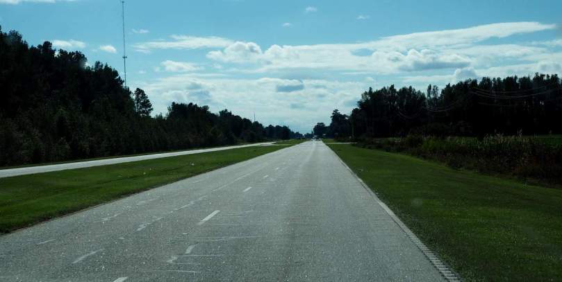 Du kannst mich echt hier absetzen und ich wüsste nicht mehr, wo Norden/Süden oder Osten/Westen ist. Es geht nämlich einfach immer nur geradeaus. Die Fahrzeugschlange, deren Bestandteil wir eben noch gewesen sind, hat uns inzwischen allein gelassen und ringsherum ist es auch auch nur noch platt ohne Ende.