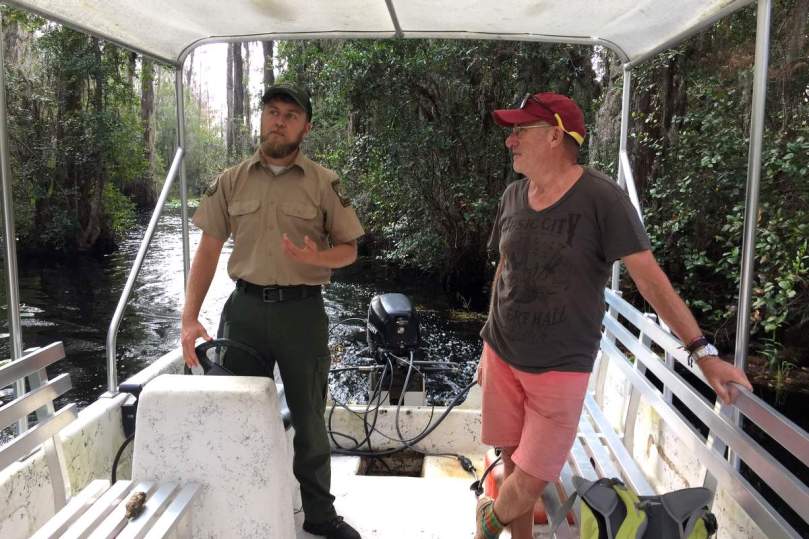 Josh ist unser kundiger Ranger, der das Boot für uns ganz allein mit sicherer Hand durch die teilweise unter der Oberfläche des Wassers versteckt auf uns wartenden Schlingpflanzen steuert: Rückwärtsgang rein, Schraube mit voller Pulle andersrum drehen lassen, Pflanzen und Wurzeln lösen sich von der Achse, Vorwärtsgang rein und weiter gehts…