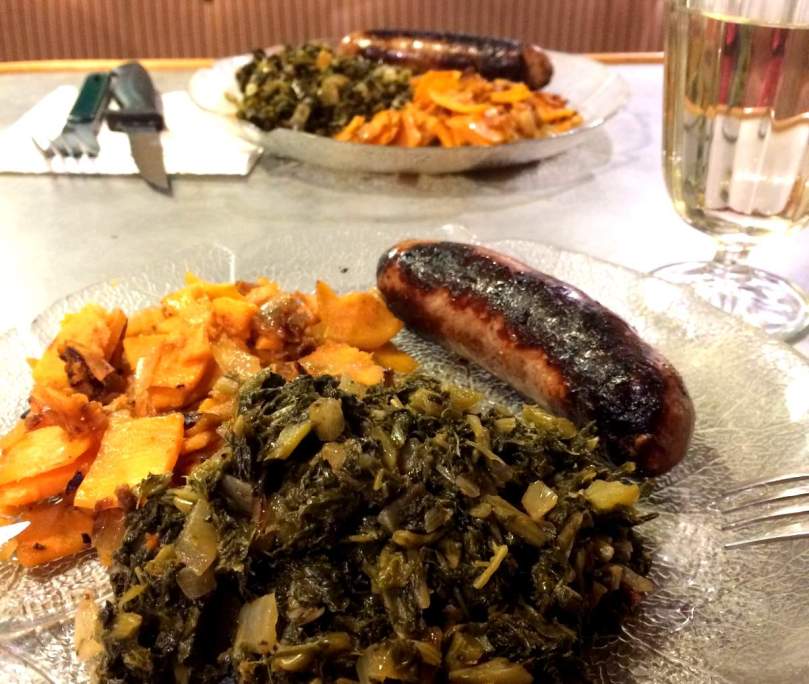 Green Collard mit Brat-Süßkartoffeln und Chickensausage schmecken zwar, ersetzen aber nicht wirklich Grünkohl mit Kohlwurst.