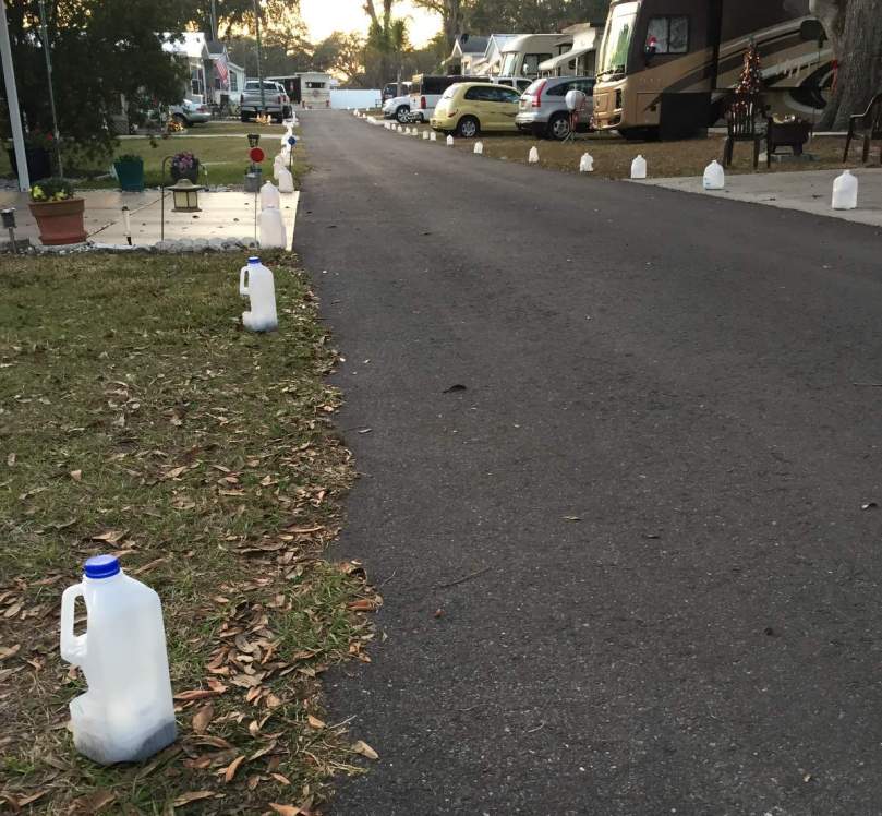 Es hat schon was von Straßenfest, wenn alle leeren Wasserflaschen aufgeschnitten werden, mit Kerzen gefüllt werden und die abendliche Beleuchtung hergeben.