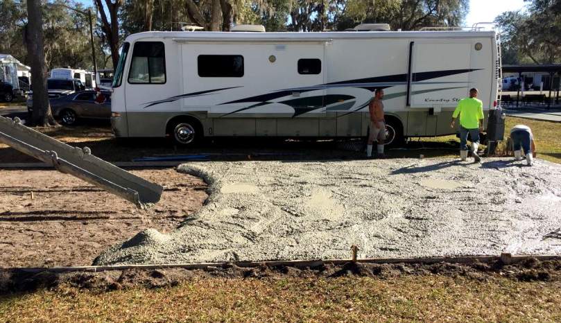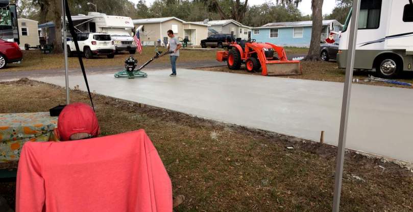 In einem sagenhaften Akkordtempo wird aus der Wiese eine Betonfläche, die einem Motorhome für die nächsten zwei Jahre einen sicheren Stand ermöglichen soll.