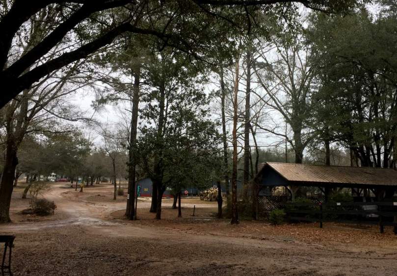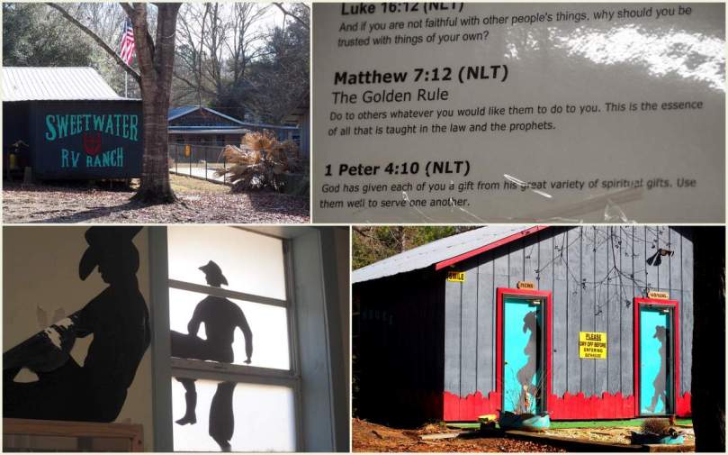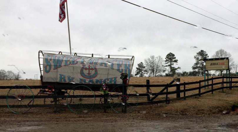 Wir biegen (unbeschadet) nach endlos scheinender schlüpfriger Backroad–Fahrt, das nieselige Wetter passt perfekt dazu, durch traurig-tristes Land von der sehr schmalen Cooper Rd scharf links ab auf die riesige Fläche der Sweetwater RV Ranch, Loranger, LA.
