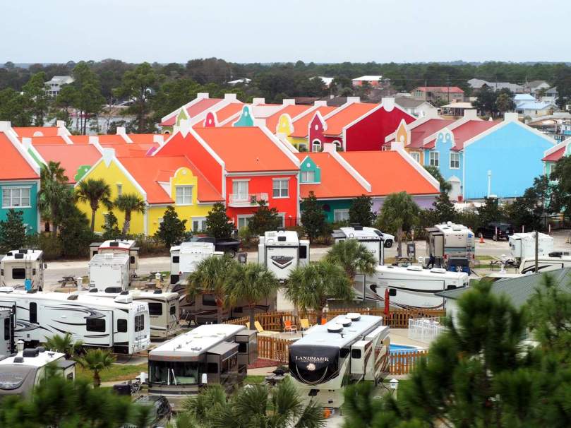 Es wird für Florida-Verhältnisse an der Alabamacoast richtig eng. Die Sonnen-, Strand- und Wasserhungrigen aus den nördlichen US-Staaten und den südlichen canadischen Provinzen mögen die im Verhältnis zu Florida preisgünstigen Plätze oder Häuser an diesem Teil der Golfküste. Mehr oder weniger nordsee-, ostsee- und mittelmeer-ähnlich stehen hier die Unterkünfte beieinander.