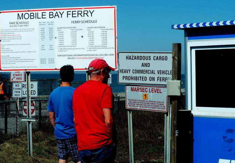 Schon nach einer Stunde erreichen wir die Mobile Bay Ferry. Wir müssen kaum warten. Ein Foto noch, dann können wir uns schon nach 5 Minuten über die Rampe auf die Fähre von Fort Morgan Richtung Dauphin Island einordnen. Handbremse anziehen, Gang rein, mit Kamera aussteigen und den Golf bei wolkenlosem Himmel genießen. Manchmal könnte es ruhig etwas langsamer gehen.